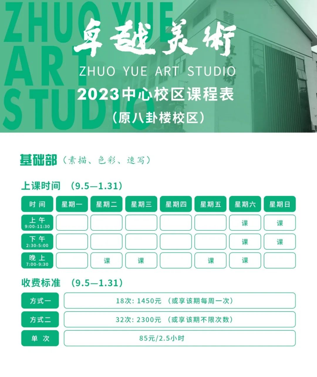 2023年再次升级,成立中心校区,位于民主路与平等路交汇处(国贸珑上对面),是漳州市中心新地标,全新装修,高端典雅,给予学生更好的学习环境和交通地段,八卦楼校区基础部迁至中心校区,保留少儿部和书法部,中心校区(总部)开设基础部和少儿部,龙文校区(荣昌)位于新浦路和荣桂路交汇处,地段优越,卓越画室还拥有龙岩校区、金峰校区、地质人家校区、蓝田校区(群芳文体中心)、长泰校区等,各校区分层次,分学科,分班级,因材施教,系统规范,方便学生就近学习,为当地提供优质学习平台。