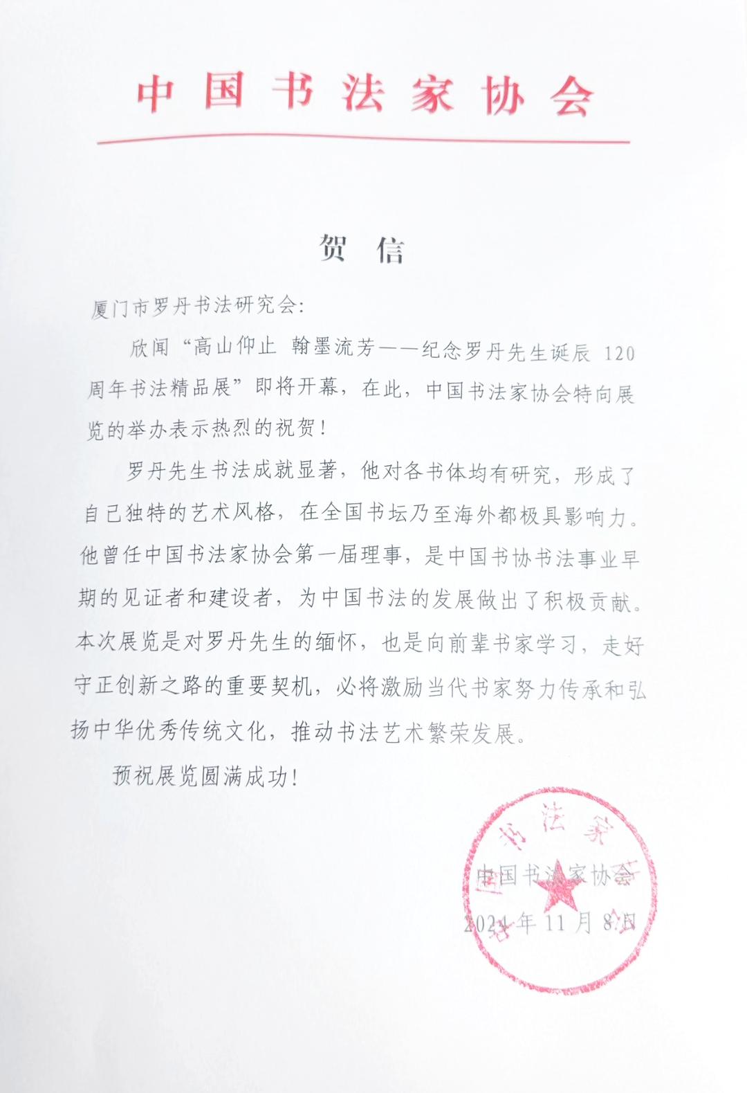 2024年11月由厦门市文联指导,厦门市书法家协会与厦门市罗丹书法研究会共同主办,主题为“高山仰止 翰墨流芳——纪念罗丹先生诞辰120周年书法精品展”在厦门美术馆举办。中国书法家协会发来了贺信,对本次活动的成功举办表示热烈祝贺,并对罗丹先生的书法艺术成就给予了高度评价:“罗丹先生书法成就显著,他对各书体均有研究,形成了自己独特的艺术风格,在全国书坛乃至海外都极具影响力。他曾任中国书法家协会第一届理事,是中国书协书法事业早期的见证者和建设者,为中国书法的发展做出了积极贡献。”