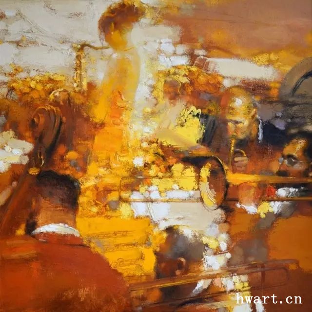 音乐作为一种流动性的时间艺术,以声音的速度、节奏等遵循一定的规律构成或低沉雄浑或悠扬婉转的绵延之音,在可见的境界中欣赏不可见的心境;我始终认为音乐所具有的生命力能给人以激励和启示。在动态平衡的原则下,音乐作品始于静,经过动的演绎,最终又回归静态;而欣赏音乐时,音乐是动的,人的状态处于静止,但心绪却又悸动。探寻和表现的实质即音乐与生活的内在性,而不是其表面形式。只有从心灵深处去表现,才能抓住音乐的动力感。其过程既是对音乐徒生情愫的诠释和表达,又是作者心灵的自我表白,传达自我从内心深处所悟到的人与音乐不可分割的感受,才能唤起人们对作品产生一种亲切的感情。记得曾经看过法国一个著名爵士乐队的现场演出:一位满头小辫的男钢琴手弹着弹着就跑到后台去了,过一会又跑出来接着弹,却觉得音乐并没有因他暂时离去而间断。这位真正懂音乐、玩音乐的行家,给人们带来激情和舒适。音乐最大的魅力莫过于对想象力的激发。在音符的流淌中,想象与联想得到了最大限度的发挥。而在绘画过程中,只有积极、主动地处理并追求特定条件下的整体和谐效果,才能在创作中主动感知、发现自然物象本身的审美内涵所在,并按自己的个性审美追求产生想象和联想,寄寓情感,将自我表现逐步过渡到具有创造力和表现力的艺术语言,升华出不同情趣和个性的艺术效果,创造出最佳趣味与意境。并非只是纯粹的记录或再现,也没有刻意具象描摹音乐演奏现场,而是通过颜料的叠加、色彩的铺陈,在抽象的笔触中营造出充满音乐听觉的视觉空间,展现乐者深沉内敛的艺术气质,从而抒发胸臆。放任想象与画笔的碰撞,尽情抒写自我的感情诉求与心怀。通过对光线明暗的对比和创设情境,营造戏剧般的效果,画面色调、用笔、造型的细微度等所有因素交织在一起,整体处理复杂画面中的人物在场景光线下的明与暗,用光线强化显现出画中的主要部分,让画面的暗部消融隐藏在暗影之中,在显现与遮蔽中呈现出画面人物的精神状态和性格特征,在明与暗、显与隐的轻松氛围中,使整个画面形成一种强烈的戏剧性效果,稳定而庄重。通过油彩层层叠压、反复调整,使细节的变化得以丰富,从刚开始那种单一而强烈的倾向性又回到自然状态,并以独有的发散思维方式敞开在画面中,画面在时间和空间中奇异地交织辉映,人物表情或坚毅自信,或深沉忧郁,或优雅高贵……通过对人物动态、面部表情和氛围营造等等表现, 所有的因素都参与其中,交织起来,展现出人的精神性,进而在笔触与色彩的相互交织中呈现出音乐的华釆,其精神灵韵也伴随着笔触的混杂、交织和颜料多层覆盖的叠压、罩染,呈现出生命的和谐、饱满与激情,乐者们被光韵照亮,正如生命的某些抽象性因素,在时间的延续中得到永恒。