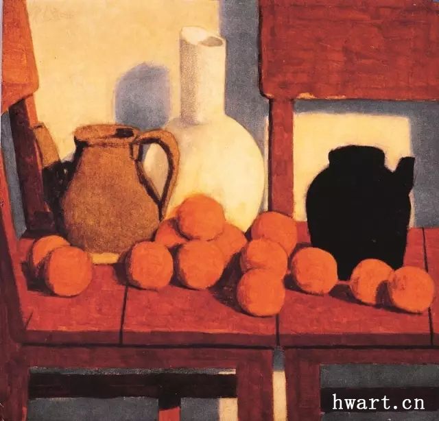 也许陈朝生早年的学习过程中,有过扎实的水粉画的训练,他的作品中,可以看出由水粉画技法带来的肯定,笔触的覆盖清晰明确,不过多修改,具有塞尚式的平面结构感。特别是静物画,可以看出一代水彩大家王肇民先生的影响,画面形体坚实而结构稳定。以《沱川三联画》为代表的一批风景画,描绘的是南方老城的印象,色彩浓郁而温暖,具有欧洲绘画中所特有的沉着韵味。静物画虽然是常见的物体,但在构图上富有匠心,不落巢窠,以《三个罐子》为例,作品具有常人所不常见的高视平线,将所有物体笼罩在一种温暖的色调中。均衡而朴实的造型,使我们想到法国画家夏尔丹的质朴,以及如眼所见的真实感,画面中每一物体都有温暖的光线笼罩,边缘柔和。
