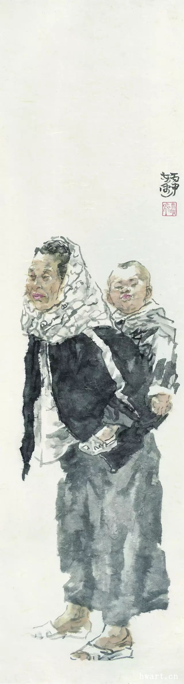 他笔下的人物画,乍看是施于泼墨而成,实际上是用大笔书写、垒加、积累渲染而成。反复积染,但不死黑,黑中透亮,亮中有灰色,灵活脱透,爽朗健朴。