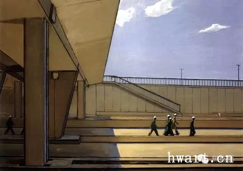 韦:“诗意”的提出是为了摆脱五六十年代的创作模式——画面像是一个舞台、人物注重写实、技法是苏联油画的“二传手”。1980年前后我去看画展,发现许多年轻人已经走在前面,我就有了一种危机感,想跟上这个时代,于是就想到突破。我画了一些实验品,有几张效果还比较好,如《立交桥》、《新线》。于是,从中提取了“诗意”、“简约”的概念。但“诗意”这两个字是比较空泛的概念,界定起来很难,它是抒发感情,是一种生命体验。“诗意”更多是指形象的含蓄、意义的多样性以及观众的参与,是三者共同的作用力。就像漫画作品必须要有“扣子”,大家参与来解开它。再就是关于“现实主义”。生活非常丰富,我抱着艺术创造的心态感受世界,这是一种愉悦,我至今仍对抒情和叙事性主题感兴趣,但是我缺少表现宏大叙事的气魄,作品中没有出现过崇高的境界。至于“简约”风格,我当时是受了霍珀的影响。他的风格很简练,敏锐而质朴。从形象塑造上来讲,他能把最平常的事物塑造得很威严,把美国繁华的生活塑造得很平静。