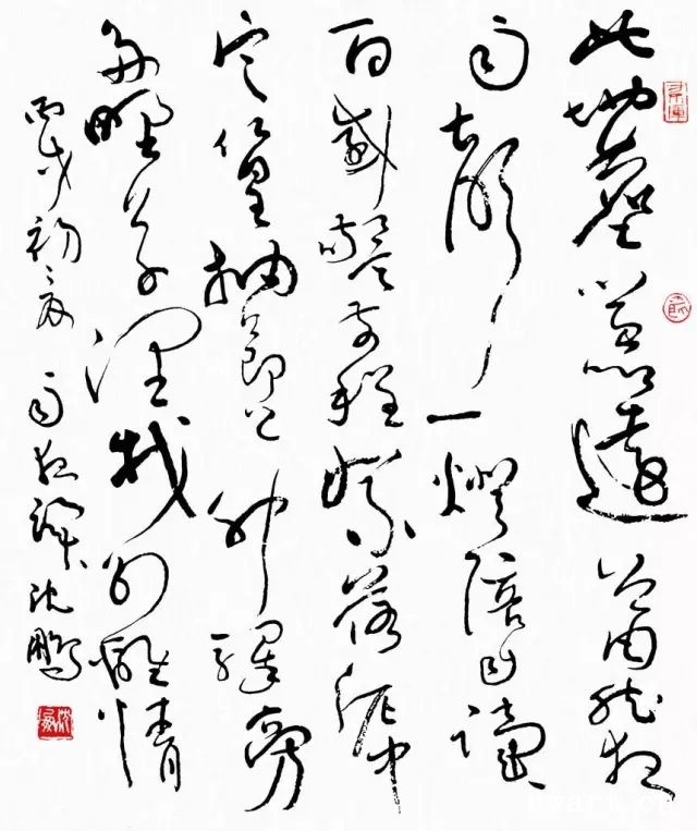就作品表现特征而言,它能以抽象的书法形式,表现作者的精神境界和艺术功力,将创作主体的精神追求和艺术功力物化为审美形态;求韵,则是沈鹏先生书法作品的审美效果,是表达其心中积蕴的难以用语言表述的艺术感觉。