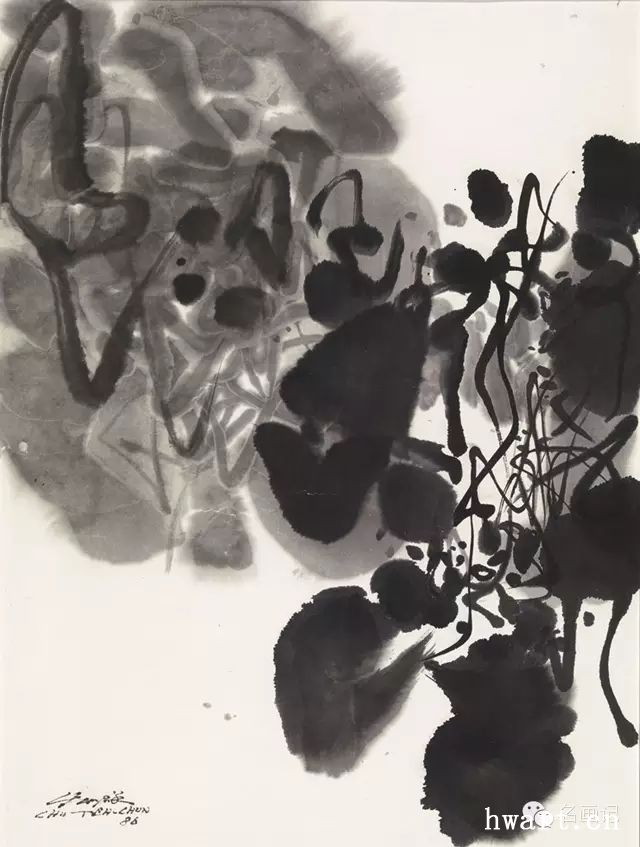 如何在这森林中找到其途径,在这儿笔墨交叉,在这儿符号与形象透过水、墨、色相互渗透,在这儿流斑和溅痕又加在表层混乱之上!这些多联屏是熔炉而非混沌,取自中国绘画三种传统形式:直式(挂幅),横式(手卷)和扇页。这隐喻般的形式转置也适于内容,首先为浸满墨的紧密团块(图录第82号和第84号),随之为不受任何透视所限制的光亮旅程(图录第75号和第83号),最后则是刹那间同时散出的有机涌现(图录第72号和第74号)。就若大的悬崖峭壁,垂直的构图高耸孤独地矗立着,深沉和遥远,充满强烈的生命。自宋以来,这些形状一再出现,可由它们所散发出的精神辨认出。一笔带活力的线条紧迫地由虚无中冒出,将数个单元连接起来,或将空间划出一道道斑纹,这是他艺术的又一特征。这绘画文字强调无止境的曲线,主要来自朱德群书法家之功力,他不断持续地练习。柔软而带韵律的形状盘曲于生命的神秘之中,第三种特征是各种蜕变,这些要归功于他对空白之处的熟练掌握,同时结合了对墨色和数目有限的色调之巧妙运用。
