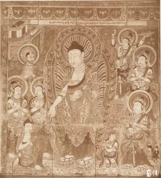 此画描绘的是释迦牟尼佛前生为大商人时,以宝石和一所令人神往的庙宇精舍,供养万物之主善目王。此图右下有一左膝跪地持盘向佛作供养状的人物,依铭文为长者,图中的却似王者。图中右上角的建筑物即供养的精舍。