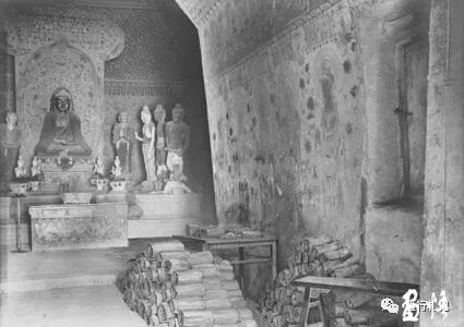 △1907斯坦因年拍摄的莫高窟藏经洞外观和经卷