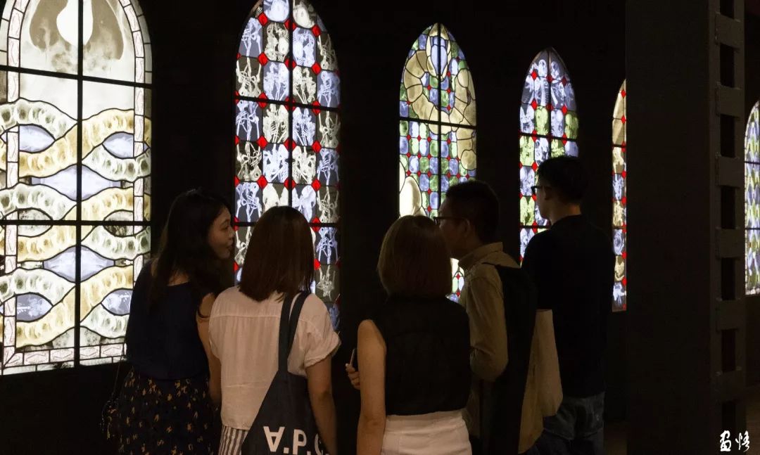 同样争议性的还有教堂彩绘玻璃系列,在展厅现场远看三片彩绘玻璃联排的时候,能感觉到的和我们在教堂现场感受到的一样精美安谧,但是当我们走近细馆却令人大吃一惊——所谓窗花图案原来是人体X光片和浊秽的图像,和宗教的圣洁纯美完全是背道而驰。德尔维的这一举动当然是“大胆”的,但正如善于言辞的艺术家本人所说:他无所畏惧,只是希望寻求肉体和灵魂之间平衡的连结。