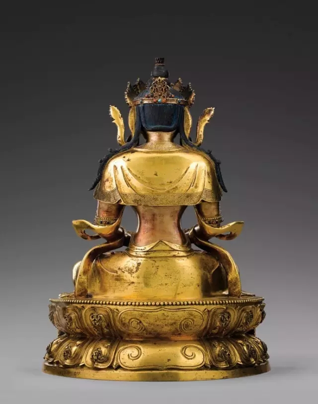 这是蒙古佛教艺术大师扎那巴扎尔(Zanabazar)的雕塑作品,这尊无量寿佛坐像法相庄严,头戴宝冠,发髻高隆,耳垂环珰,其下饰有花瓣坠,二侧耳际宝缯向上飞扬,束发披于两肩。面相方圆,五官俊朗,神态慈悲安详。上身斜披圣带,胸前佩饰项圈挂件、全身饰有臂钏、手钏、足钏、腰饰等无价珠宝璎珞所制饰品,庄严全身。下身着贴身薄裙,錾刻有精美的纹样。双手结禅定印,双跏趺坐安住于莲花月轮之上。莲花法座做工精美,莲瓣宽肥饱满,造型生动,手法写实。