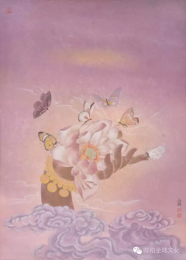 益群别出心裁,作画"佛手"系列:佛手轻拂色相人间,卷起了千里烟波,人生万千苦与乐。万尘自指缝中流走,万象在佛手,便开出了花。亦不免让人想起了那句诗:" 如何让你遇见我,在我最美丽的时刻,为这,我已在佛前求了五百年,求佛让我们结一段尘缘。