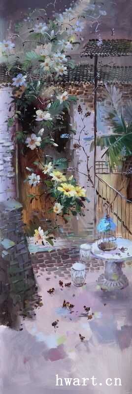 作品名称:《庭院风景 》尺寸:120x150cm材料:布面油画