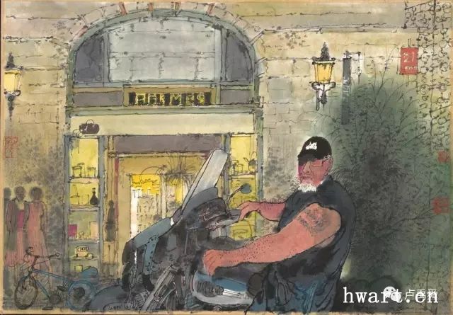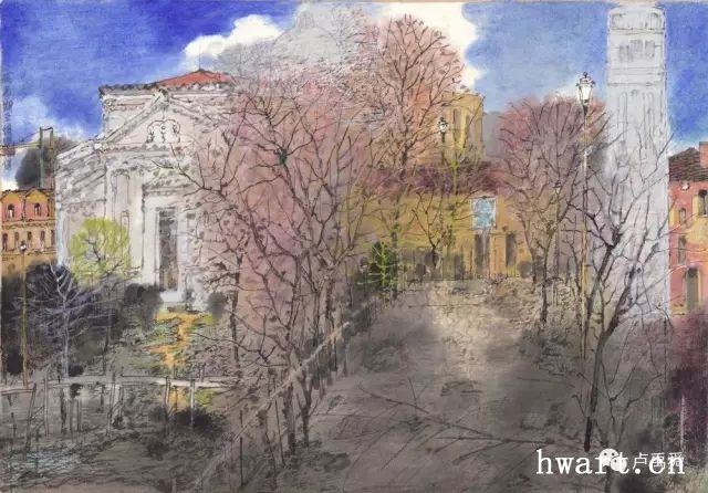 與他以往系列作品中對天地人的那種渾然和諧的追憶與神往不盡相同,“一帶一路·人類文明”系列作品涉及了現代文明與自然傳統、現代自然與現代人文、東方與西方等現實矛盾。我們知道,山水畫從其傳統的特點來說,在表現都市景觀、建築和當代生活內容方面優勢並不突出,這也是山水畫在傳統向現代轉型的過程中一直糾葛的難題之一。然而盧禹舜在“一帶一路·人類文明”系列作品中,並沒有回避這些,而是以觀照和超越的態度,以浪漫的詩意,將自己的體驗、冥想、性靈和激情投射進去,創造出城市文明中和諧唯美的境界。這種基於現實之上的超越和詩意表現方式對於當代山水畫的現代轉型,以及當代山水畫如何處理傳統與現代、時代與生活以及東方與西方關係等問題無疑會有借鑒意義。或許當畫家面對世界敞開胸襟,物我默契,神合為一時,他也就獲得了精神上的超越與自由。這時無論是一草一木、一山一石,還是一建築一街燈就都擁有了它本身的生命和特質。如果說,對於現代化的都市,工業化的社會和越來越被理性、消費所束縛和分裂的現代人來說,和諧、寧靜、無擾,怡然自足在現實中真的越來越難以實現的話,那麼,藝術倒至少可以創造一個可游可居的精神家園,在這個意義上,立足於中國精神和中國審美人生態度的“一帶一路·人類文明”系列作品便具有了普遍性意義,它以單純、和諧之美給予人們普遍被壓抑的本能一個瞬間的滿足,保護了人的靈性,並進而獲得了擺脫現實原則的高度自由。