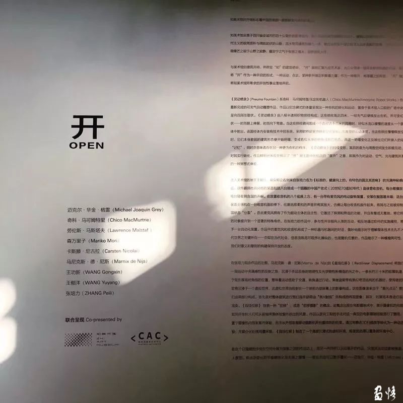 在展言面前,张尕说:“‘开’以打开、展开、延展这些动词组成展览的结构,作品给大家带来人与机器,人与人、机器与机器间的关系的思考,及水、瓦这些元素,流动着与周围景色、自然、建筑契合。”