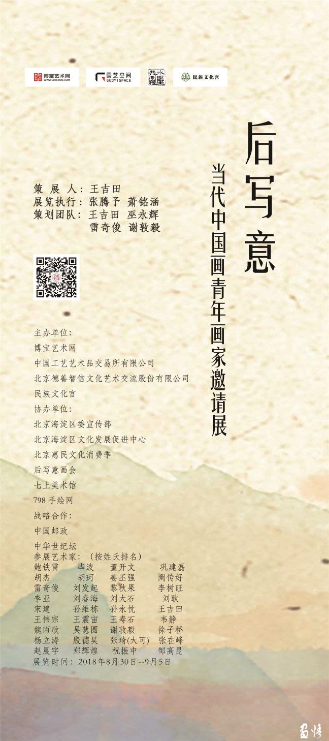 这里拈“后写意”一词作为这次展览的主题,其一是因“后”字够通俗、易传播;其二就是和当下的“写意”概念予以区分,脱出写意画现有的窠臼、樊篱。旨在邀请诸位画界同仁,在这一新时期共同探求写意画的新图式,永葆文心,为重塑中国画的写意精神做一些探索。