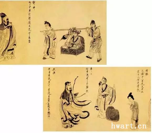 “寒山”和“拾得”是唐代的两位高僧。寒山好吟词偈,神情疯癫。拾得是孤儿,为寺庙僧人拾到收养,在寺里伙房打杂,与寒山友善。历代画家喜欢以此为画题。两位人物,一人染淡墨,一人用白描,以战笔和铁线描写衣纹。