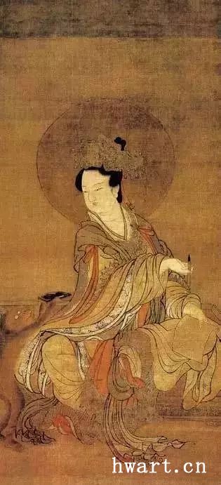 美丽的水星神坐在榻上,右手执笔,正要书写。旁边一只小猴已经高举起石砚,供她填笔。小猴全用没骨法,极富质感,表情天真有趣。