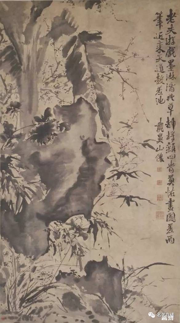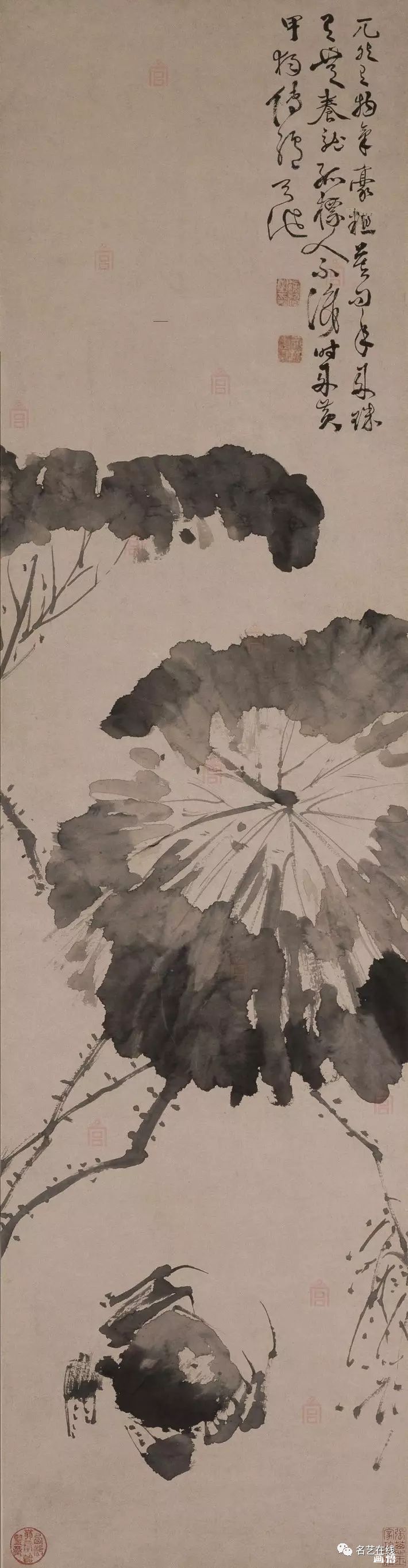 上图片为明代画家徐渭的《榴实图》:纸本墨笔,纵91.4cm,横26.5cm,藏于台北故宫。徐渭粗放随意的风格,让人想到唐宋画家“逸品”的粗率画法。《榴实图》是以少胜多,以简取胜,大写意派画风的杰作。画面上留有大块空白,境界开阔,运笔仿佛是受表现主义的精神支配大于写实主义,堪称淋漓尽致。