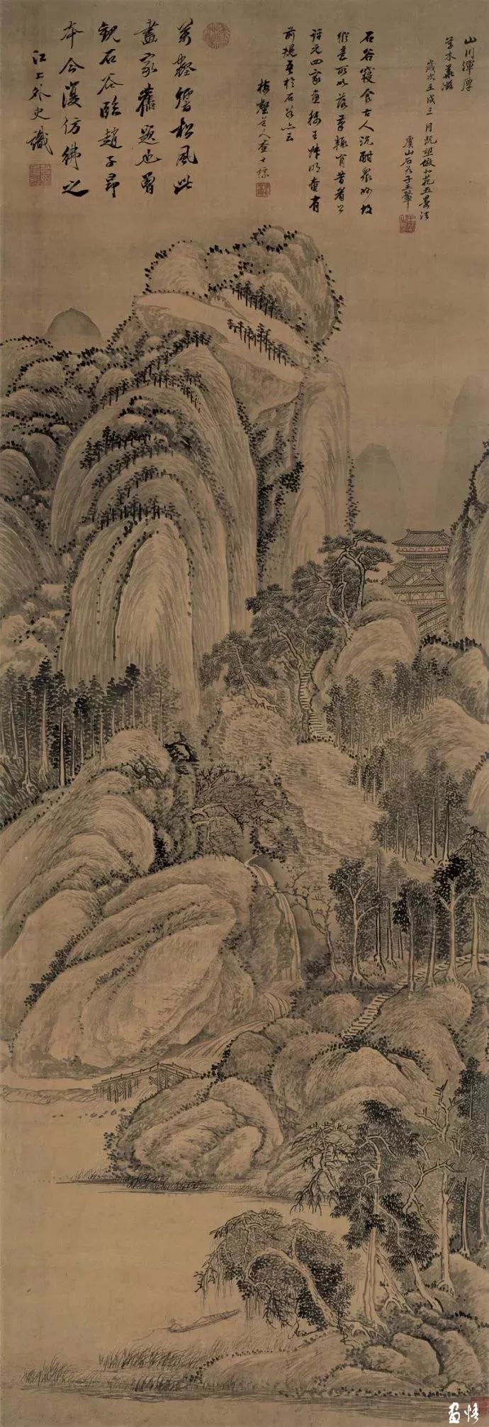 王翚最后一次临《富春山居图》的时候,亲自到富春江去走了一遭。大概花了一个多月,感悟富春江的云影岚光,奇岩峭壁,重山复岭,环抱屏峙。