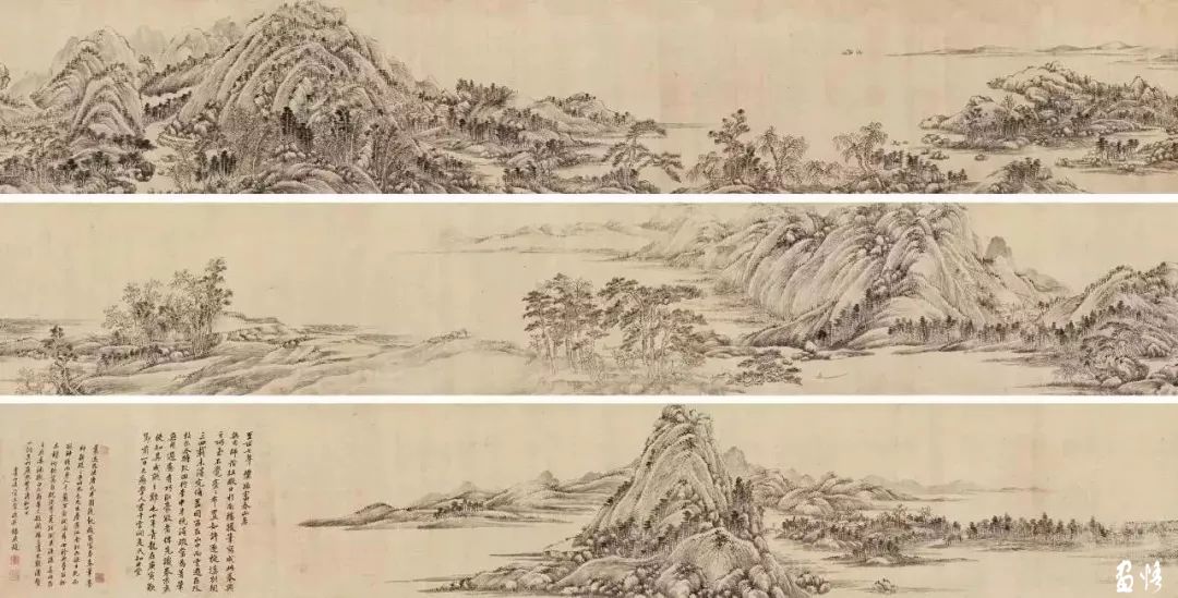 《富春山居图》长卷是黄公望的晚期作品,长三丈六尺,画面展示的是富春江沿岸的景色,平沙远渚,水郭烟村,峰峦叠嶂,全卷大气磅礡,浑沉雄厚。