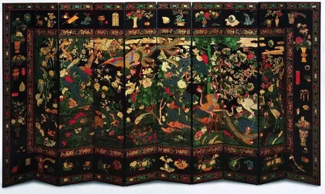 清康熙·西湖通景花鸟博古纹黑漆款彩屏凤