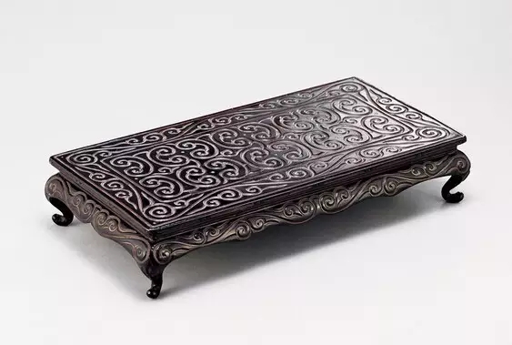 先用填漆的方法做好花纹,然后沿着花纹轮廓勾出阴文线,勾出花纹上的纹理,增加画面丰满度之后,再在阴文线内填金,雕填技法盛行于明清两代。